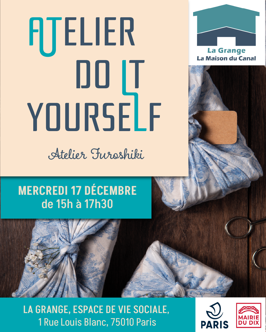 atelier diy - furoshiki :emballages cadeaux japonais réutilisablesLe mercredi 17 Décembre de 15h à 17h30. Apprenez une technique traditionelle japonaise pour emballer vos cadeaux avec du tissus. Des emballages réutilisables pour sublimer vos cadeaux avec vos tissus préférés !