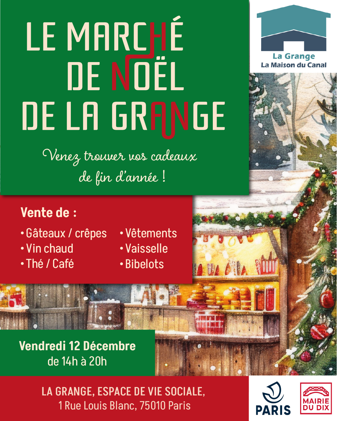 le marché de noëlde la grangeLe vendredi 12 Décembre de 14h à 20h. Vente de gâteaux, crêpes, boissons chaudes, vêtements, bibelots... Venez trouver vos cadeaux de fin d'année !
