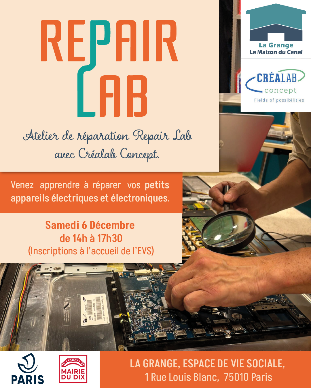 RepairLab - atelier de réparationLe samedi 6 Décembre de 14h à 17h30. Venez apprendre à réparer les petits appareils électroménagers, électriques et électroniques. Formez-vous aux gestes techniques de base pour détecter et identifier les pannes, résoudre les problèmes techniques courants.