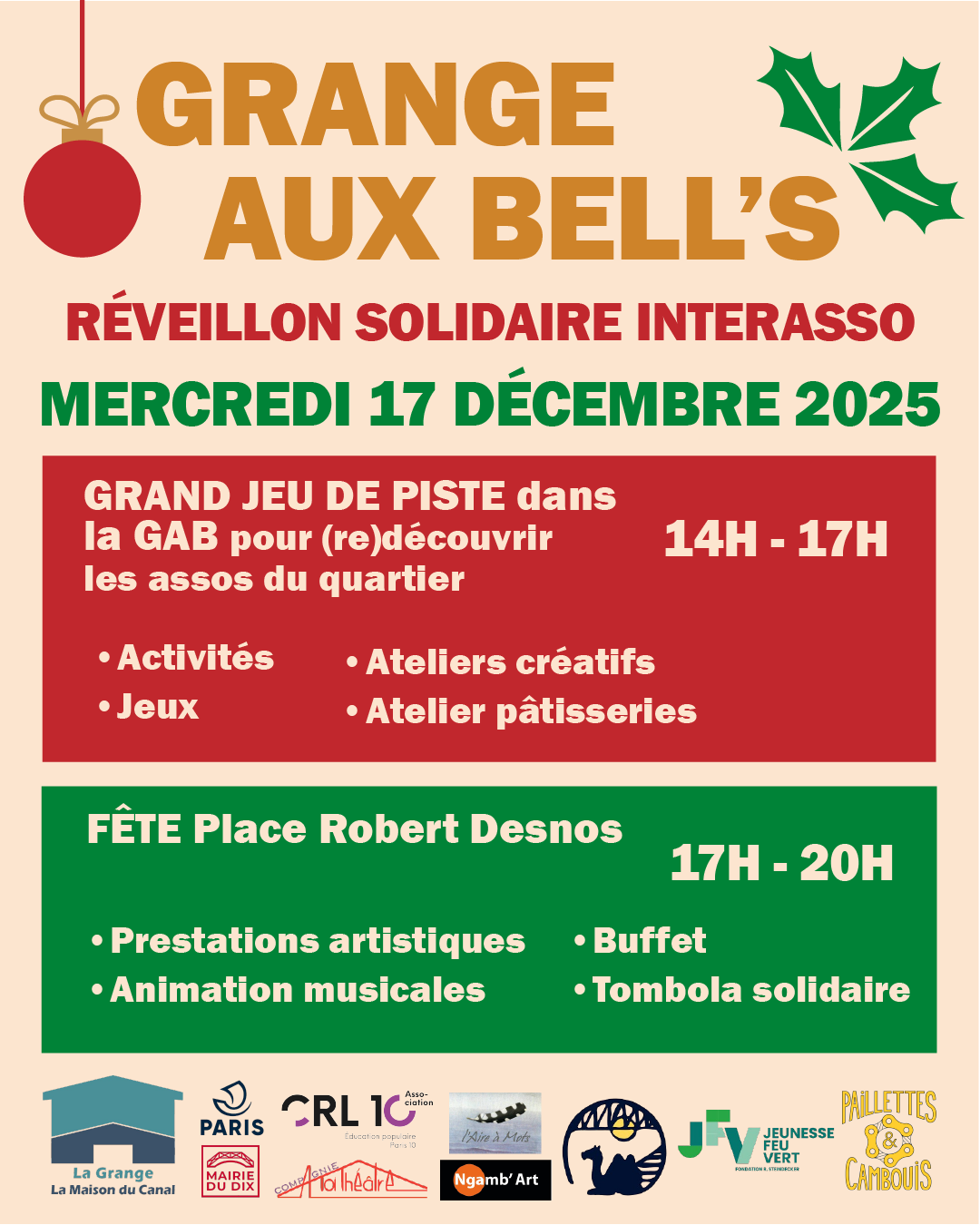 grange aux bell'sréveillon solidaire inter-assoLe mercredi 17 Décembre de 14h à 20h. Venez participer à un grand jeu de piste dans la GAB pour découvrir les associations du quartier, avec un temps convivial, une animation musicale et un buffet en fin de journée !