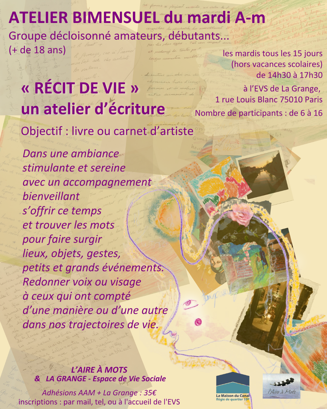 Atelier d'Écriture "rÉcit devie" animÉ par l'associationl'aire à motsAtelier bimensuel le mardi de 14h30 à 17h30 Que vous soyez débutants ou confirmés, venez participer à cet atelier d'écriture intergenerationnel ! Que vous souhaitiez vous raconter, partager un souvenir ou faire vivre la mémoire de celles et ceux qui ont compté pour vous... cet atelier est fait pour vous !